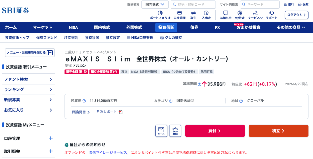 SBI証券に、クレジットカード登録が完了したら、積立する投資信託と毎月の積立額を設定します。
