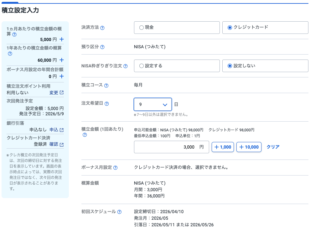 クレジットカードの積立設定を行うと、初回スケジュールが表示されますので、こちらで正確なタイミングを覚えていけば、全く問題ないですので、安心してくださいね。