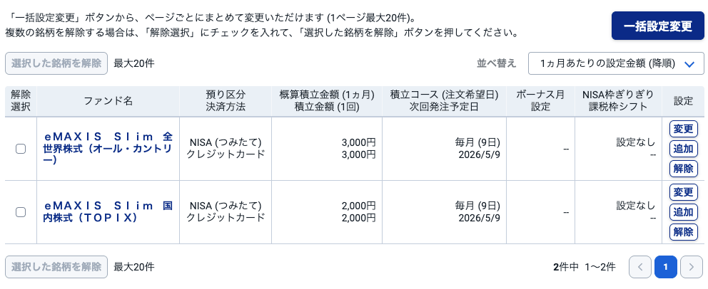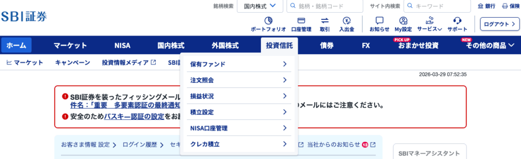 反映されないと思ったら、まずSBI証券の『投資信託』→『積立設定』を確認してください。