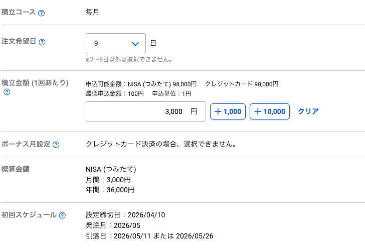 SBI証券のクレカ積立は基本的に『毎月の定期積立』に特化しており、ボーナス月の追加設定やスポット購入のクレジットカード決済は制限される場合があります。