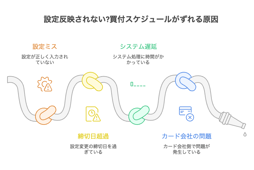 カード有効期限の切れや決済エラーは買付失敗の典型的な原因です。