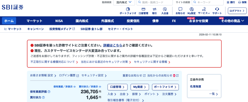 PC画面になりますが、ログインして、口座管理を押したら、すぐ口座サマリーを確認できますので、状況の確認が可能です。